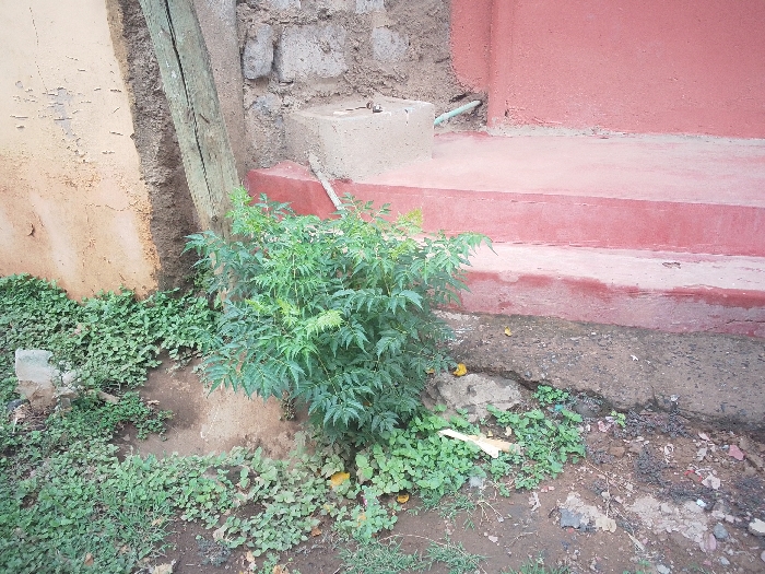 The scene, located in Juja ward, Kenya, displays an exterior view of a building corner and the immediate surrounding ground. No individuals or animals are present. On the left, a wall with peeling, faded light-orange paint borders a vertical, weathered wooden post featuring a prominent crack. This post abuts an unrendered section of rough, dark stone blocks. To the right, a red-painted wall meets a red-painted concrete structure forming two steps. A light-colored concrete block rests near the red wall's base, from which a light blue pipe segment emerges. The foreground consists of uneven dirt ground, partially covered by dense low-lying green ground cover. A central green bush with multiple compound leaves dominates the immediate foreground. Scattered on the dirt near the bush are several small yellow objects and a piece of white debris. Darker, possibly damp, soil patches are visible in the far right of the frame.