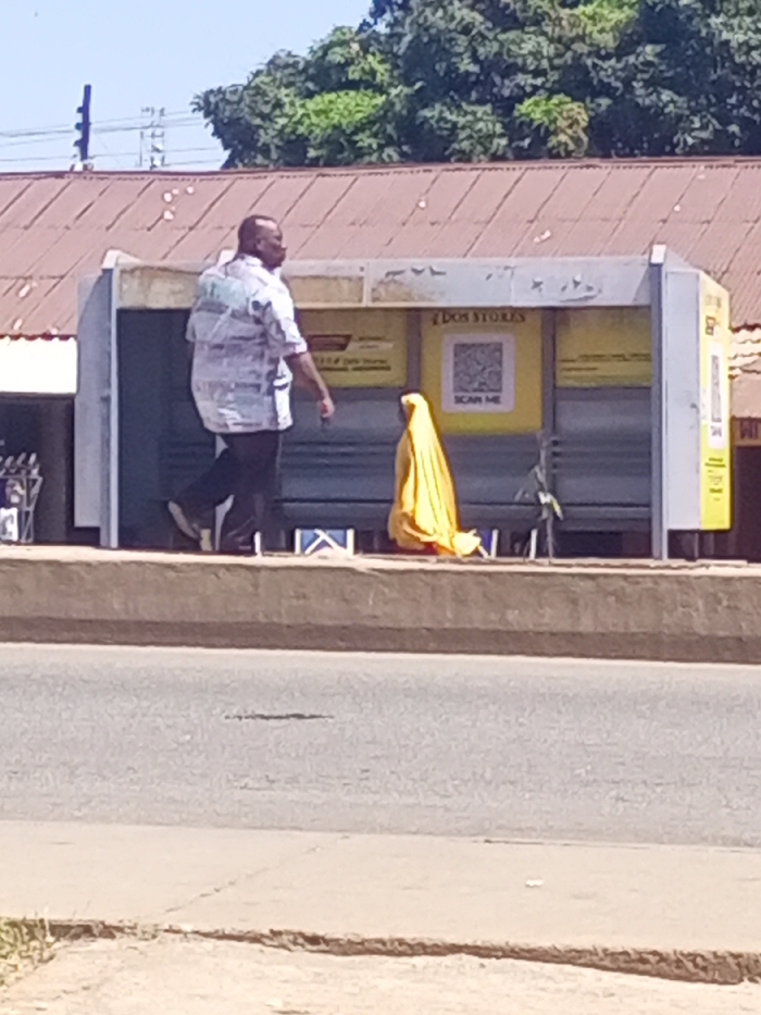 An outdoor scene in Jos, Nigeria, depicts a roadside bus stop on a clear, sunny day. The foreground shows an asphalt road separated by a concrete curb from a raised sidewalk. A light-colored bus shelter with a rusty-red corrugated metal roof stands on the sidewalk. Inside the shelter, a dark-colored bench is visible. The back wall of the shelter features three yellow advertising panels; the central panel prominently displays "DOS STORES," a QR code, and "SCAN ME." An adult male, with dark skin and short dark hair, is walking from left to right, partially in front of the bus shelter. He wears a light-patterned short-sleeved shirt, dark trousers, and light-colored shoes, with his right foot raised mid-stride. Inside the shelter, a human figure is seated or crouched on the bench, entirely covered by a bright yellow cloth draped from head to ground. Small, unidentified objects rest on the bench to the left and right of the yellow-clad figure. In the background, behind the bus shelter, a building with a similar rusty-red corrugated roof is visible, along with dense green tree foliage and a utility pole on the far left. The scene is brightly illuminated by direct sunlight.