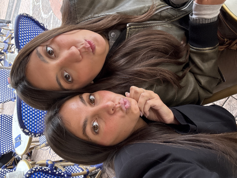 A close-up, high-angle selfie portrays two adult females in an outdoor café in Antibes, France