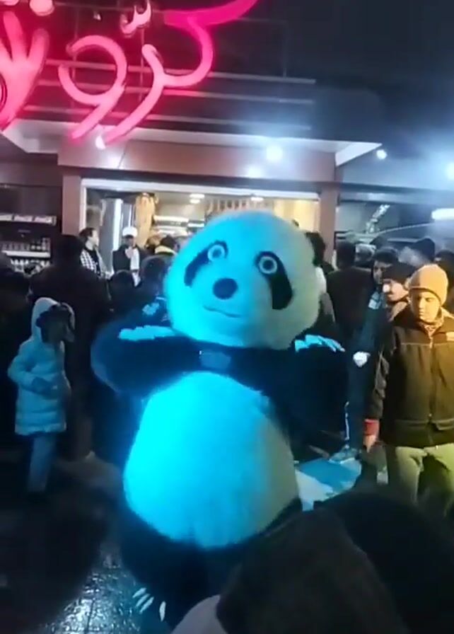 panda mascot standing in front of a storefront with a red neon sign. The mascot appears to be dancing to music as a crowd of people watches. The lighting changes colors. The location appears to be an outdoor mall or shopping area at night.