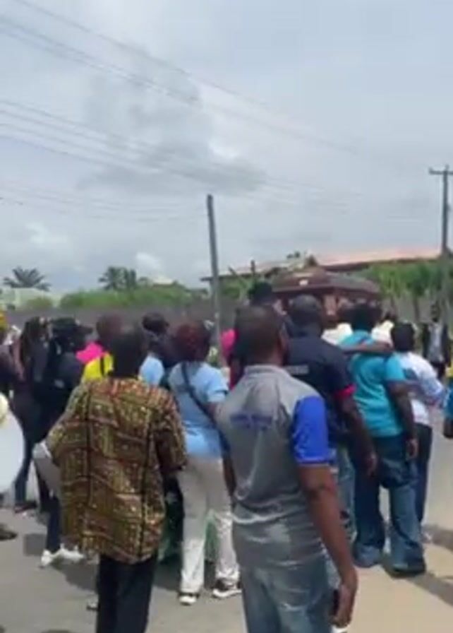 A crowd of people is walking down a street on a sunny day. Most of the people are wearing brightly colored t-shirts or tops. The people in the front are playing musical instruments. The band is wearing brown and green patterned shirts, black pants, and black shoes. Some members are playing trumpets, while others are carrying a large drum. There are overhead wires visible in the background, and there are houses and trees in the distance.
