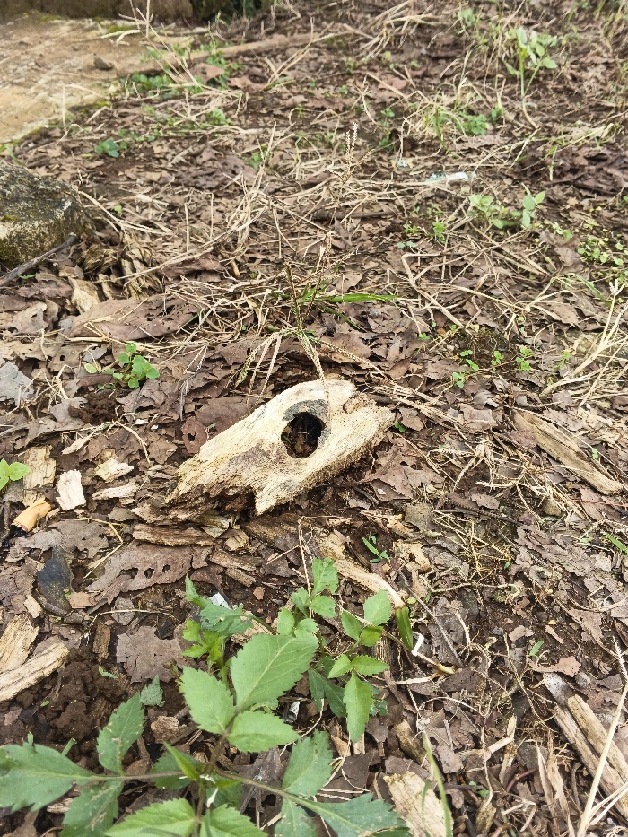 A piece of decaying wood with a hole lies amidst a bed of brown leaves, twigs, and scattered greenery. The wood is light in color, showing signs of weathering and decomposition. Small green plants sprout around the base of the wood. The surrounding area is covered in dead leaves, small sticks, and various bits of plant debris. A concrete edge is seen on the upper left side.