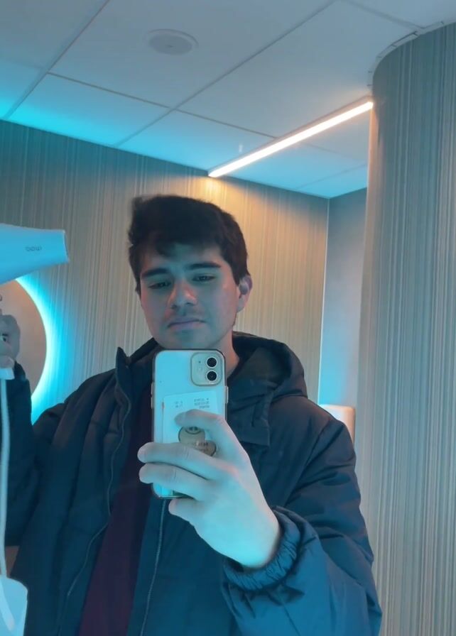 A young man is recording a selfie video in a restroom with blue-toned lighting. He is holding a white hairdryer in his left hand and an iPhone in his right hand. He begins to use the hairdryer on his hair while continuing to record the video. He pauses, looks at the camera, smiles, and the video ends. He is wearing a dark-colored puffy jacket over a maroon shirt. The background includes tiled walls and a cylindrical column with vertical ridges.