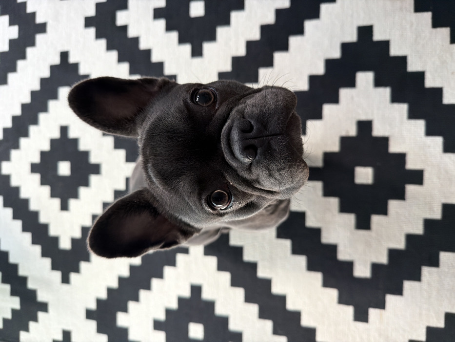 - "A dark-furred French Bulldog, characterized by its prominent erect ears, broad muzzle, and dark, round eyes, is depicted from a high-angle perspective" by FM-TOA2r1, licensed under CC BY 4.0