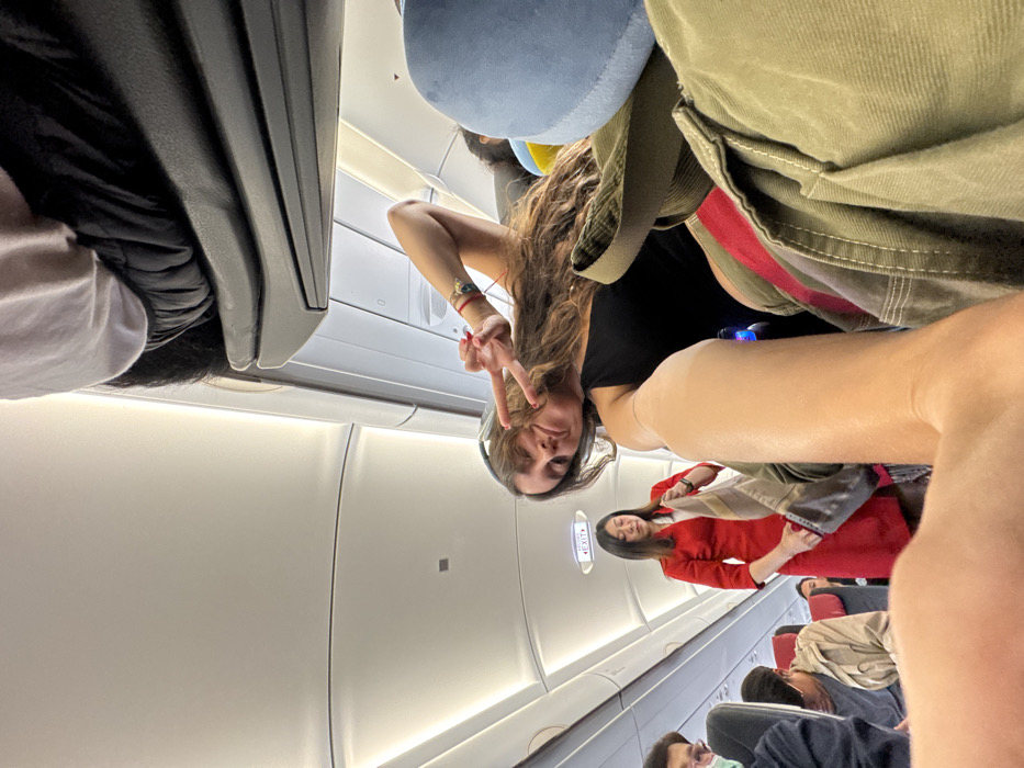 interior of an airplane cabin, where a woman is taking a selfie. She is wearing headphones and making a peace sign with her fingers. There is a flight attendant in a red uniform visible in the aisle. The cabin is filled with passengers seated, some of whom are wearing masks. Overhead bins and the plane's ceiling are also visible.