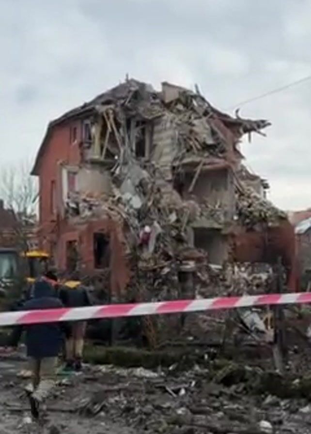 two-story red brick building that has been severely damaged, possibly by an explosion or impact. A significant portion of the building's structure has collapsed, leaving debris scattered around. Red and white striped tape is strung up, likely marking the perimeter of the damaged area. There are three people visible near the tape, and one appears to be wearing dark clothing and walking towards the building. A yellow construction vehicle is visible on the left side of the frame. The ground around the building is covered with debris and appears muddy. The sky is overcast. Someone is standing inside the building.