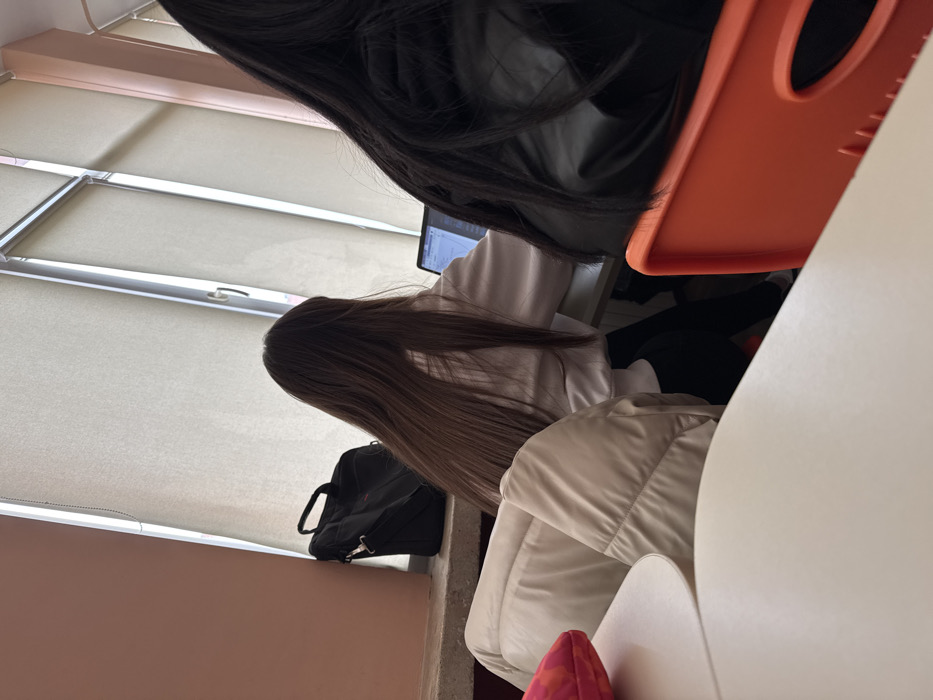 The image depicts an indoor scene, likely an educational or work environment, within the city of Silistra, Bulgaria. In the mid-ground, a person with long, straight, dark brown hair is seated at a light-colored desk, facing away from the viewer, and actively using an open laptop. They wear a light-colored long-sleeved top and dark trousers. A light-colored puffer jacket is draped over the back of their chair. To the left, a black shoulder bag rests on a concrete-like windowsill adjacent to a pale pink wall. The background consists of multiple tall windows fitted with light-colored roller blinds, admitting natural light. In the immediate foreground to the right, the upper back and dark hair of a second individual are visible, wearing a black jacket and seated in a bright orange chair. A light-colored desk occupies the lower foreground. The specific establishment within Silistra cannot be determined from the visual evidence.