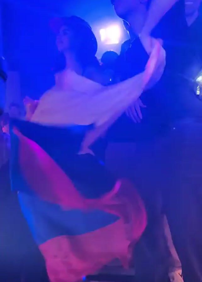 A group of young adults is partying in a nightclub, illuminated by blue and pink stage lights. One woman wears a pink cowboy hat. The partygoers dance on a stage or platform. One person waves a large Colombian flag, its yellow, blue, and red stripes blurring with the motion. Someone wears dark sunglasses. Other figures are discernible in the background. The music is loud.