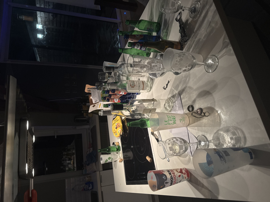 - "A chaotic aftermath scene features a kitchen counter littered with empty wine and beer bottles, various glasses, and a bottle opener" by FM-KddfD3, licensed under CC BY 4.0