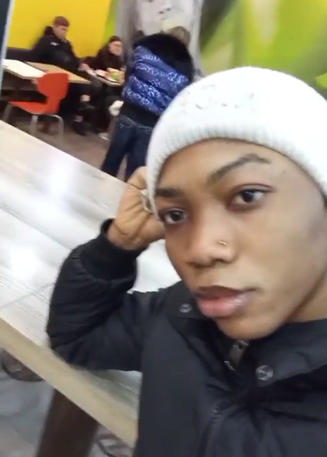 A close-up selfie shows a person with dark skin, wearing a white knit cap and a black puffy coat. They have a nose ring and are resting their head on their hand. They briefly purse their lips. In the background, other people are sitting at tables in what appears to be a fast-food restaurant. The wall is decorated with a yellow and green mural featuring a child eating. A man in a green jacket walks behind the subject. The lighting is bright and slightly yellow.