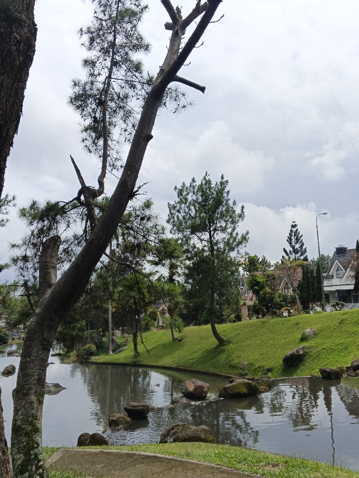 The scene depicts a natural landscape adjacent to a residential area under an overcast sky in the city of Unknown, Unknown. In the foreground, a dark-barked tree trunk is partially visible on the far left, bordering a patch of green grass and a concrete edge. A prominent, leaning tree with dark bark and sparse pine-like foliage extends across the mid-left portion of the image. A body of dark, calm water, possibly a pond or stream, occupies the central midground, featuring several partially submerged dark rocks. The water's surface exhibits reflections of the sky and surrounding trees. The right bank of the water body presents a gently sloping, manicured green lawn. Multiple pine trees and other green trees are scattered along this grassy slope. In the background, several houses with distinct architectural styles, including visible roofs, dormer windows, and light-colored facades, are situated on an elevated terrain above the green slope. A dark streetlamp pole with its luminaire is visible on the upper right side. No individuals or animals are present.