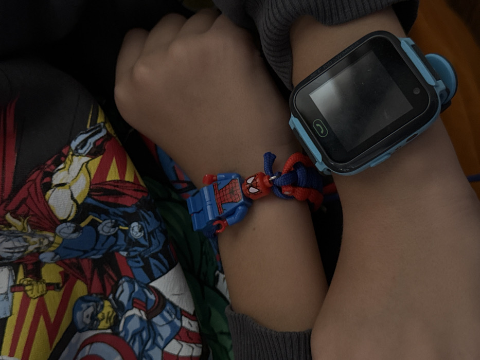 This close-up image, situated in Armavir, Armenia, depicts the forearms and hands of an individual, likely a child. The left forearm wears two Spiderman-themed bracelets: an upper bracelet featuring a blue Lego-style Spiderman minifigure attached to a dark blue cord, and a lower bracelet with a smaller, red and blue woven Spiderman figure. The right forearm is adorned with a blue and black smartwatch, featuring a dark rectangular screen and a green phone icon button. Visible in the background is a T-shirt displaying comic-book style illustrations of Marvel characters, including Thor wielding Mjolnir and Captain America. A dark grey ribbed sleeve cuff is present on the right arm. The immediate environment beyond the subject's attire is dark and indistinct.