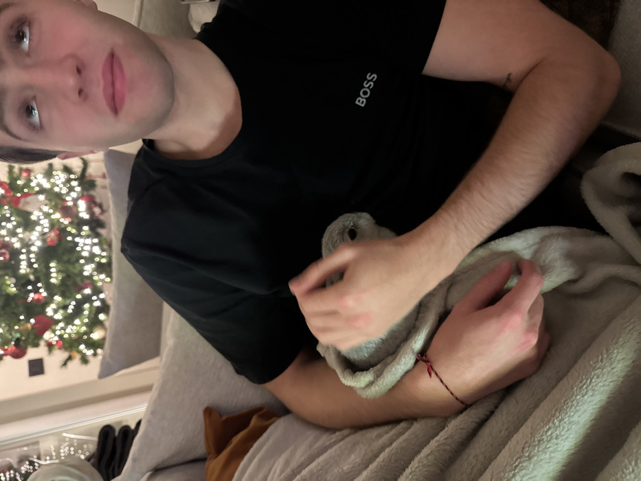 A person wearing a black BOSS t-shirt lies on a gray couch with a Christmas tree in the background. They are holding a gray, plush object, possibly a toy or blanket, in their arms. A red and black string bracelet is visible on their wrist. The scene suggests a cozy, relaxed setting.