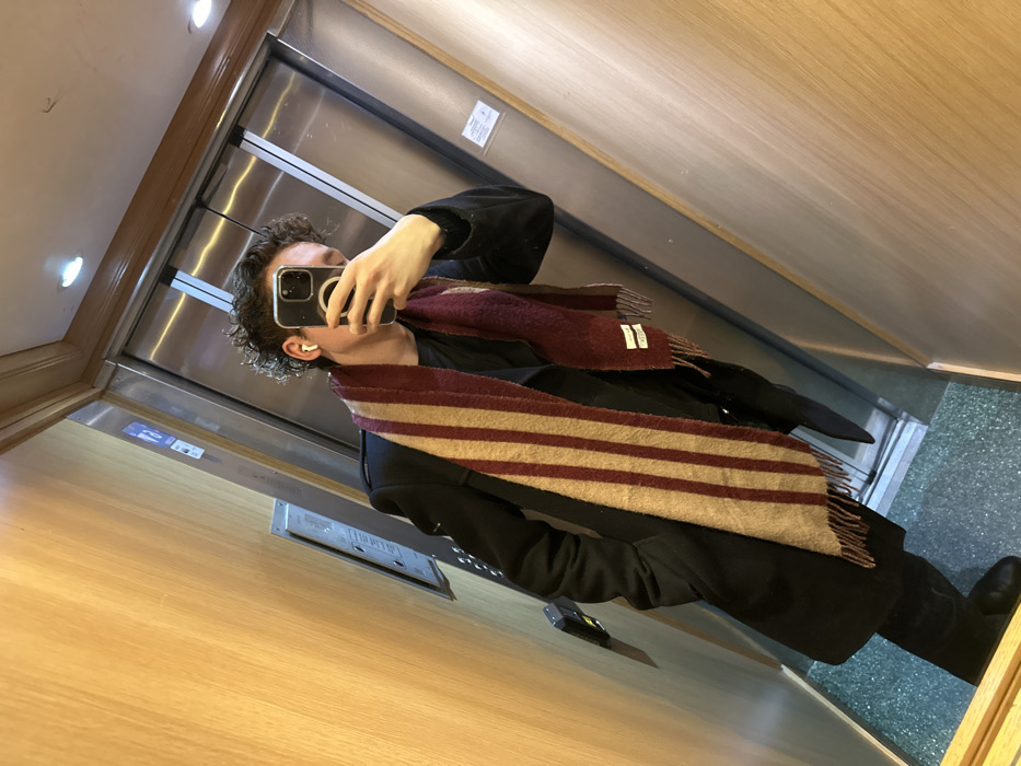 An individual is depicted in a selfie photograph, taken inside an elevator. The person, likely male, is captured from the chest down to the feet, holding a dark-cased smartphone with a visible MagSafe ring in their right hand, which obscures much of their face. They have curly dark hair and are wearing white wireless earbuds in both ears. The individual is dressed in a dark, long-sleeved coat or jacket over a dark shirt, paired with dark trousers and black shoes. A striped scarf, featuring alternating vertical bands of maroon and beige, is draped around their neck, displaying fringed ends and a small white tag. The elevator interior features light-toned wooden paneling on the walls, a dark green speckled floor, and a light-colored ceiling with recessed lighting and wooden trim. A metallic control panel with buttons is visible on the left wall. Polished metallic elevator doors, showing vertical seams and reflective surfaces, occupy the background, with a blue-and-white sign partially visible on the left door frame and another white rectangular sign on the right. The scene is located in a building in Paris, France.