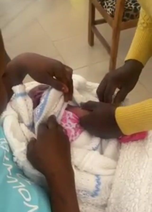 In a well-lit indoor scene, a baby wrapped in a white knitted blanket with blue trim and wearing a pink floral patterned garment is being examined by two individuals