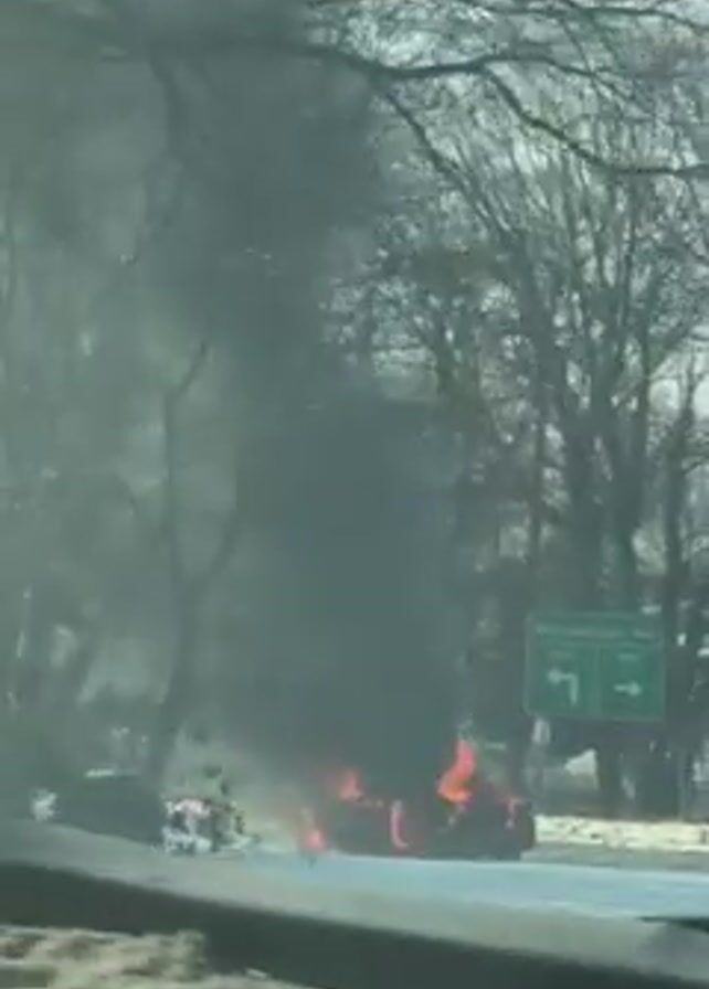 car on fire on the side of a road, with a large plume of black smoke rising into the air