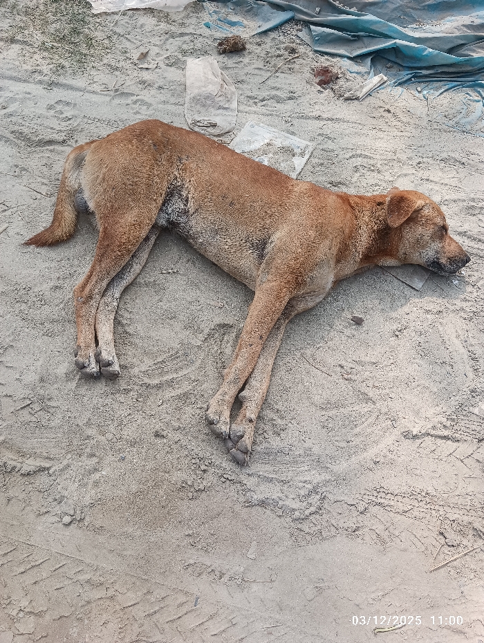 A tan and brown dog is observed lying on its left lateral side on sandy terrain in Kaliganj, Bangladesh