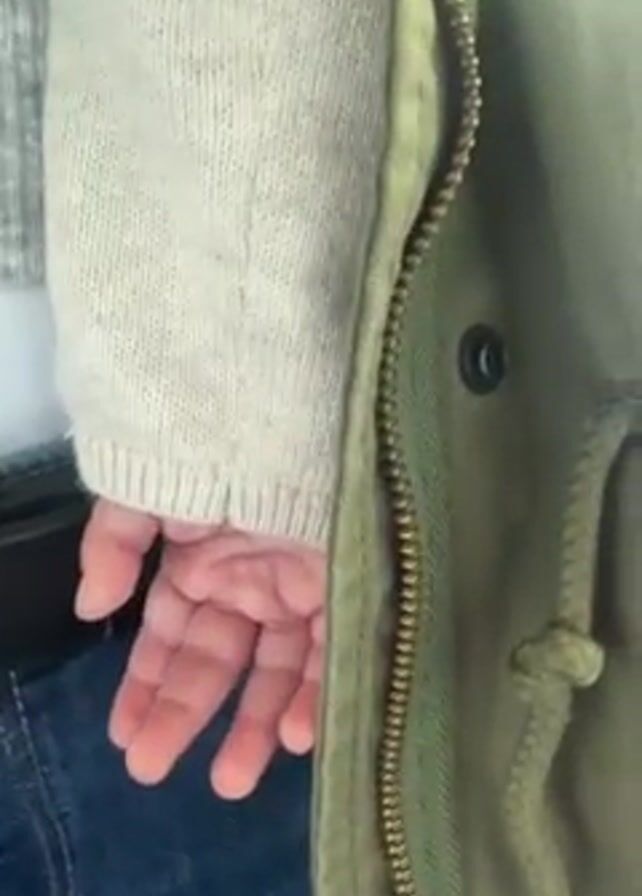 lower torso of a person wearing blue jeans with a black belt, a gray sweater, and a light-colored top peeking out. An open olive-green jacket with a zipper runs down the side. The person is standing still. Ambient sounds suggest a noisy environment, possibly outdoors.