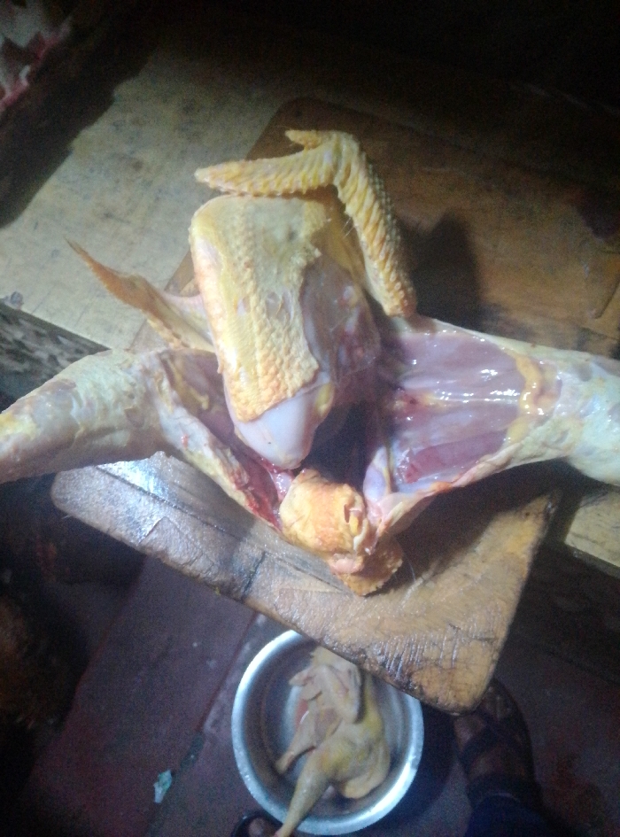 The scene depicts a dimly lit poultry preparation area. A plucked and partially butchered chicken lies splayed on a dark, well-worn wooden cutting board, exposing muscle tissue and bone structure within its open cavity. The chicken's head and neck are absent. One wing, still attached to the torso, is visible near the top left. A silver-colored metal bowl, positioned on the floor below the cutting board, contains a second plucked, whole chicken. The floor visible is dark and appears to be a basic concrete or tiled surface. At the bottom right, the lower legs and feet of an individual, wearing dark footwear and clothing, are discernible, indicating their presence at the workstation. This setup is consistent with a market stall or small butchery operation in Nairobi, Kenya, dedicated to poultry processing.