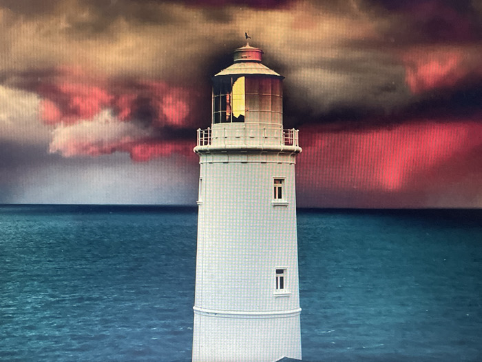 A tall, white cylindrical lighthouse dominates the center of the image, set against a dramatic, turbulent sky and a vast body of water