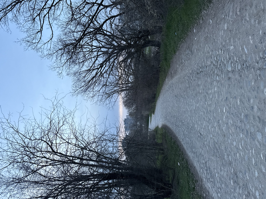 The image depicts a winding cobblestone path through a natural area at twilight. The path, composed of irregular grey stones, recedes into the distance, curving left. On both sides, numerous deciduous trees stand bare, their dark branches silhouetted against a pale blue sky that lightens towards the horizon. Dense, leafless bushes and green ground cover line the path's edges. In the distant background, a cluster of multi-story, light-colored buildings is partially visible above the tree line. No individuals, animals, or specific actions are observed. The scene is located in Unknown, Unknown.