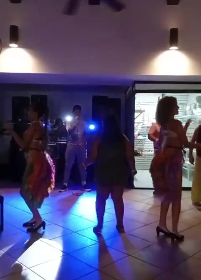 Inside a large room with a checkered tile floor, a live musical performance is taking place. Three women are dancing near the front of the room, accompanied by a man playing keyboard and singing into a microphone. The dancers are wearing sequined tops and skirts made of colorful leaves or fabric. Additional people can be seen standing around the perimeter of the room, observing the performance. Speakers are set up on either side of the musicians. A ceiling fan rotates above, and lighting is provided by recessed lights and blue spotlights. A doorway on the right side of the frame leads to another room with a lighter atmosphere.