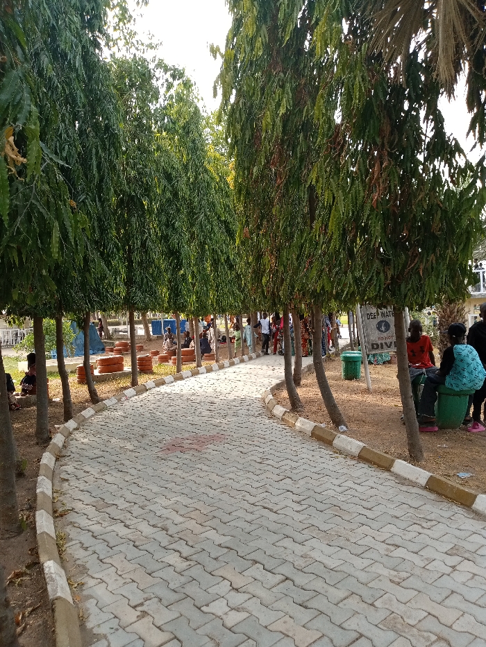 The scene is a paved walkway lined with trees and bushes in a park in Yola, Nigeria, located at latitude: 9.2, longitude: 12.468. The pathway curves to the left, and it is made of interlocking grey bricks. There are white painted lines on the edges of the pathway. There are people sitting on benches on the right side of the walkway. There is a sign that reads “Deep Water Do Not Dive.” It is a sunny day and the trees cast shadows on the ground.