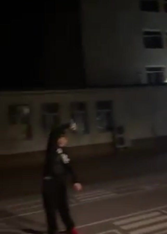 At night, in a dimly lit outdoor space, a person in a black hoodie and pants, wearing red shoes, throws a piece of paper or trash onto the ground. The person then approaches the camera, smiling. The space appears to be a playground or a paved area with painted lines resembling roads and lanes. A multi-story building is visible in the background. The scene is captured with a slightly shaky camera movement.