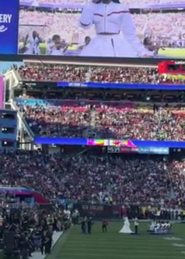 The video captures a live performance at a packed stadium, where a singer is visible on a large screen. The stadium is filled with spectators, who seem to be enjoying the performance. On the field, a small group of people are gathered near what appears to be a wedding party, including the bride in a white dress. People in suits are present. The overall atmosphere is lively and festive. The stadium has multiple tiers of seating and is illuminated by natural sunlight. The image on the screen shows the singer in a white outfit, accompanied by performers. The field is green.