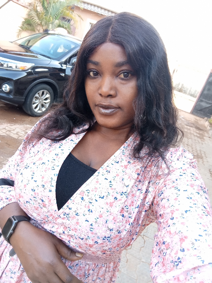A medium shot portrays a woman with dark hair and fair complexion. She's wearing a floral-patterned dress with a visible black underlayer. A black smartwatch adorns her left wrist. Behind her is a black SUV, with a palm tree partially visible in the background. The scene appears to be outdoors on a paved area.