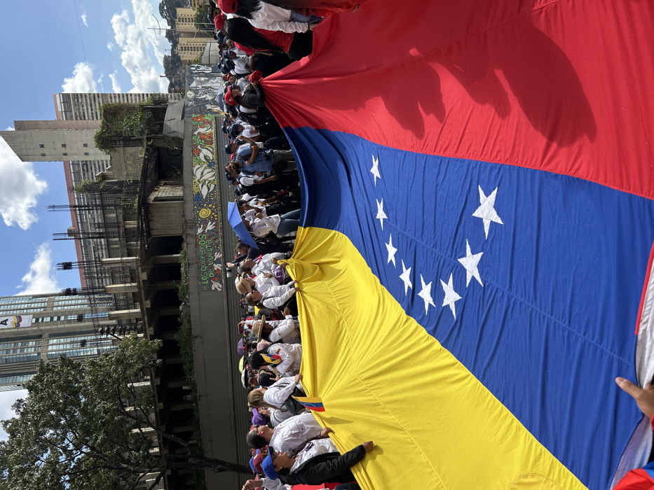 A large Venezuelan flag is held up by a crowd of people