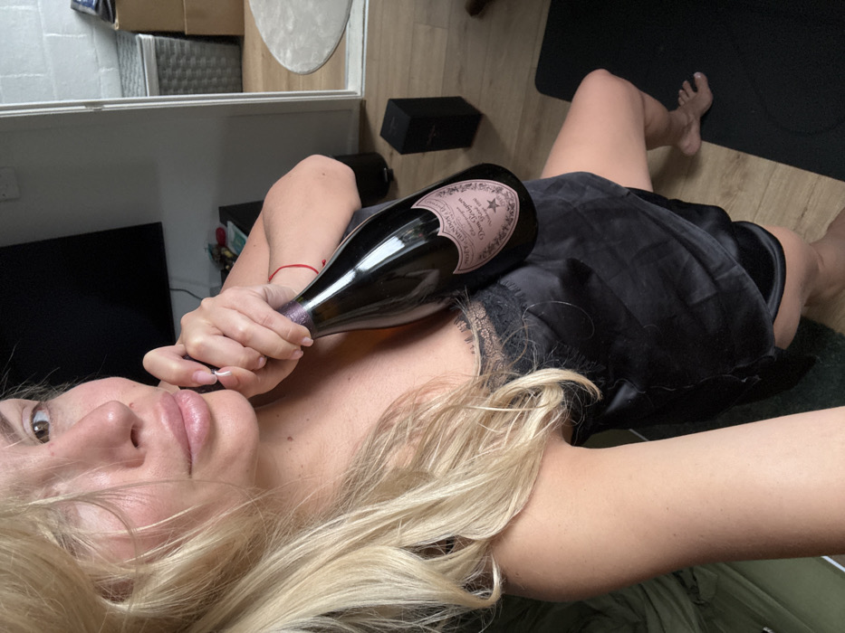 A blonde adult female is depicted indoors at a residential location in Crawley, United Kingdom. She wears a black satin camisole with black lace trim. She is holding a bottle of Moët & Chandon Dom Pérignon Rosé Vintage 2006 champagne with her right hand, resting it against her left upper torso. A thin red string bracelet is visible on her right wrist. Her left eye is partially obscured by blonde hair. She is barefoot, with her right foot resting on a dark mat on a light-colored wooden or laminate floor. In the background, a wall-mounted dark flat-screen television is visible. To the right, a large reflective surface (mirror or glass) shows a partial view of a round light-colored rug, a grey woven basket, and cardboard boxes. A dark rectangular object rests on the floor near the reflective surface.