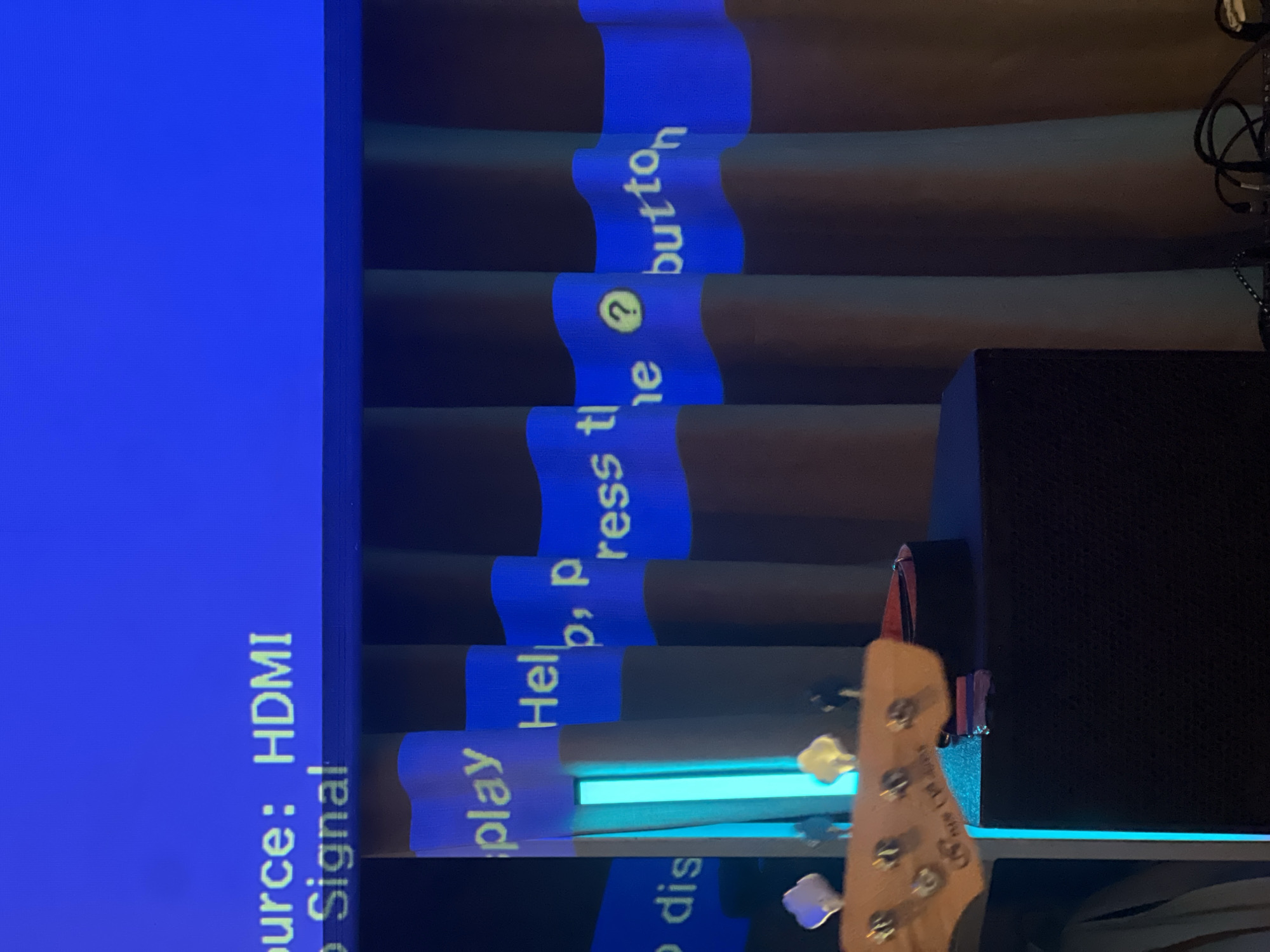 blue screen displaying the message "Source: HDMI No Signal". The text "display Help, press the ? button" is also visible on the screen. In the foreground, part of a guitar neck with tuning pegs is visible, positioned in front of the screen. The environment includes what appears to be a speaker or amplifier cabinet to the right of the guitar neck, along with a shelf or surface holding various objects. The image does not contain any location specific details to ascertain the city of Boreti, Montenegro.