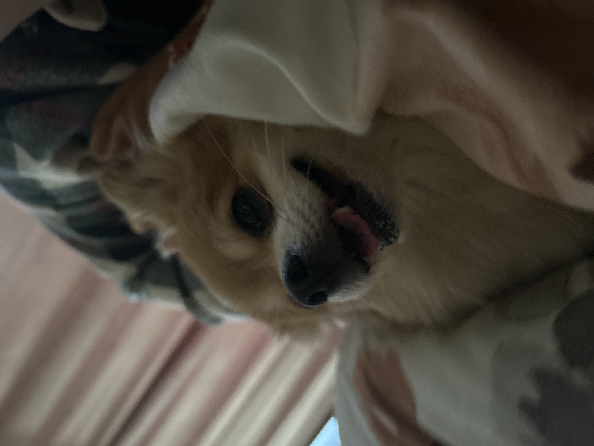 This image captures a close-up, low-angle perspective of a small, fluffy dog, believed to be a Pomeranian or a similar Spitz breed, situated in an indoor environment in the city of Varshets, Bulgaria. The dog, which has light brown and cream-colored fur, occupies the central and right portions of the frame, looking slightly upward and to the viewer's right. Its mouth is slightly agape, revealing a portion of its pink tongue, contributing to an expressive appearance. Dark, round eyes are visible. A human hand, with light skin, is partially observed on the left side of the dog, with fingers near the dog's head and neck area, suggesting direct interaction such as petting or holding. The background on the upper left consists of blurred, vertically striped fabric, likely curtains or blinds, in hues of light pink and beige. To the upper right and partially obscuring the dog, there is a dark-colored fabric with indistinct lighter patterns, consistent with a blanket or bed covering. Lighter fabric, possibly bedding, is also present in the lower left of the frame. The lighting is soft and indirect, illuminating the dog and its immediate surroundings.
