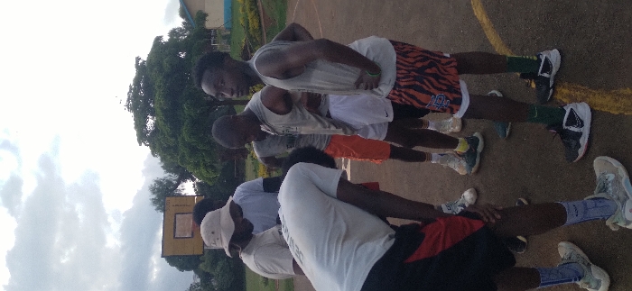 A group of at least four young men are standing on a basketball court outside on a cloudy day. They appear to be stretching or warming up. They are all wearing athletic attire, including tank tops, shorts, sneakers, and socks. A basketball hoop and a tree are visible in the background.
