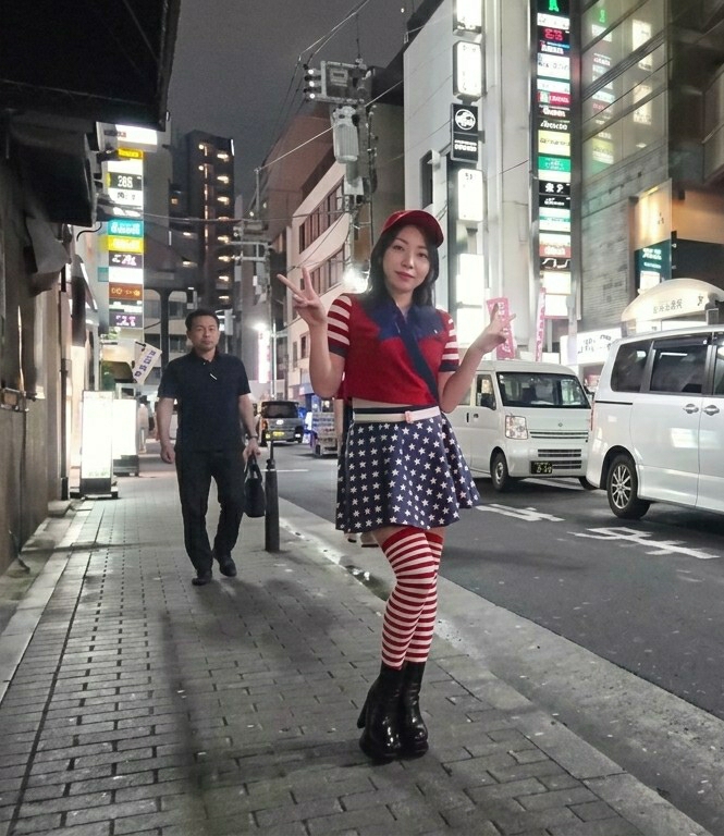 The image depicts a nighttime urban street scene in Shinjuku, Japan. In the foreground, a young East Asian female poses on the edge of a brick-patterned sidewalk, facing the camera. She wears a red baseball cap, a red and white striped polo shirt, a blue skirt with a white star pattern, red and white striped knee-high socks, and black platform boots. Both of her hands are raised, forming peace signs, and she exhibits a slight smile. Behind her and to the left, a middle-aged East Asian male walks on the sidewalk, facing away from the camera's direct line of sight, holding a dark bag in his left hand. He is dressed in a dark short-sleeved polo shirt and dark trousers, appearing to be walking independently. The street is an asphalt roadway, bordered by commercial buildings featuring multiple illuminated vertical and horizontal signs with Japanese text. Overhead, utility poles are visible with numerous intersecting wires. Two white vans are parked or driving on the street behind the female: a white kei van with a Japanese license plate (580 え 6-39) and a larger white passenger van further back. The overall lighting is artificial, emanating from streetlights, building signs, and vehicles, indicating a nighttime setting. No direct interaction between the two individuals is observed.