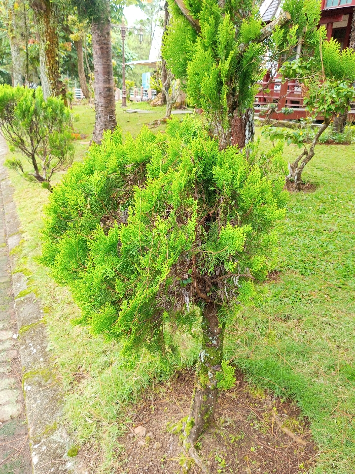 The scene depicts an outdoor garden or park environment within the city of Orehat, India. In the foreground, a vibrant green, rounded evergreen shrub with dense, fine foliage and a moss-covered lower trunk is centrally positioned, rooted in dark soil. To the left, a partially moss-covered brick or stone pathway runs parallel to the shrub. To the right of the shrub, a manicured lawn of green grass extends. The midground features multiple tree trunks of varying thicknesses, including a slender evergreen tree to the right and several broader-trunked trees to the left. Further into the midground, an ornate dark metal lamppost is visible near a white-roofed, open-sided structure. A wooden building with a reddish-brown roof and exposed wooden beams is partially visible on the far right midground. No individuals are present in the image. The lighting is diffused, consistent with an overcast sky.