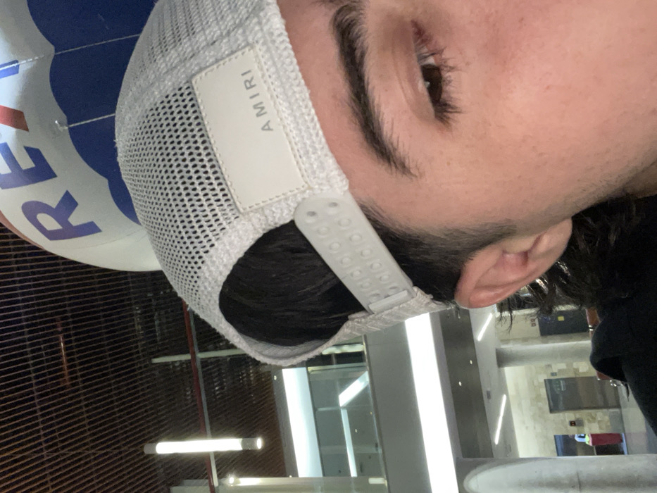 A person wears a white mesh AMIRI baseball cap. Part of a fencing mask, red, white, and blue, is also visible above the cap. The person has an eyebrow, an eye, and an ear visible. The photo is taken indoors with modern architecture in the background. The lighting appears to be fluorescent.