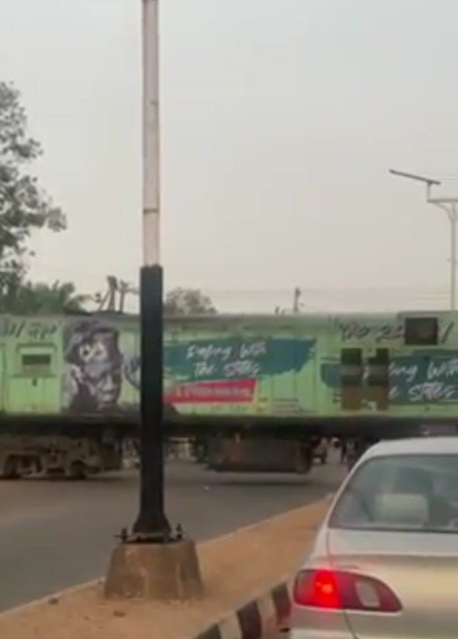 cars waiting in traffic on a street behind a large, green and blue truck, while a man looks out of its driver's side window. The truck has large graphics and writing on its sides. Behind the truck is another truck with graphics.