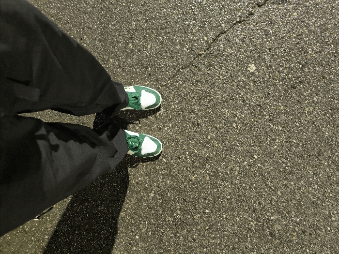 A low-angle shot depicts a person standing on wet pavement. The individual is wearing baggy black pants and green and white sneakers. A dark shadow extends from the person onto the ground. A crack runs along the top of the pavement. The background texture is grainy and slick with moisture, reflecting light unevenly.