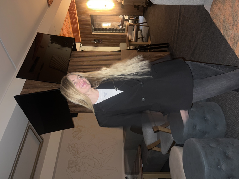 The scene depicts the interior of the Dukley Beach Lounge in Budva, Montenegro. A young adult female with long, wavy blonde hair is positioned centrally, facing slightly right from the viewer's perspective and exhibiting a subtle smile. She is dressed in a black double-breasted blazer over a white crew-neck top featuring a dark triangular logo, and dark grey or black pants. Her right hand shows slight motion blur. The floor is covered with dark grey carpeting. In the mid-ground, grey upholstered low stools and a grey upholstered booth are visible, alongside tables with dark surfaces and wooden chairs with light grey cushions. The left background features a light-colored wall decorated with a minimalist linear mural depicting multiple human figures. A central structural column and adjacent wall sections are clad in vertical wooden slats. Two large, dark flat-screen televisions are mounted high on the wooden-clad structure. To the right, an opening reveals an additional seating area with more tables and chairs, further wooden slat paneling, and warm wall-mounted lighting fixtures. The ceiling incorporates sections of light plaster and distinctive orange-brown geometric patterned panels.
