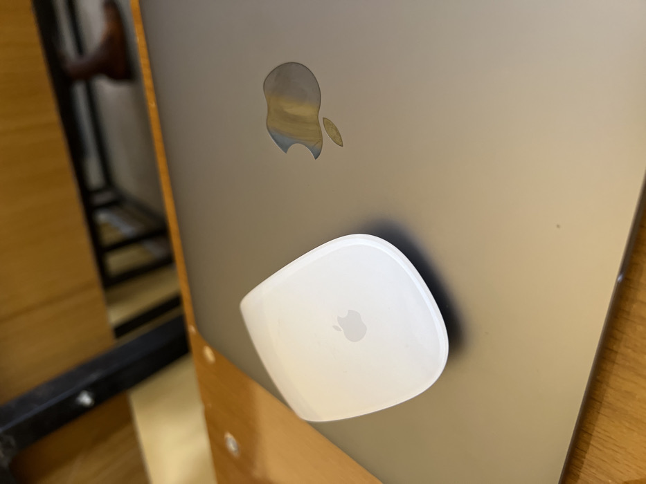 - "The image presents a forensic overhead view of a white Apple Magic Mouse resting centrally on the closed dark grey lid of an Apple MacBook laptop" by FM-pgYUG2, licensed under CC BY 4.0