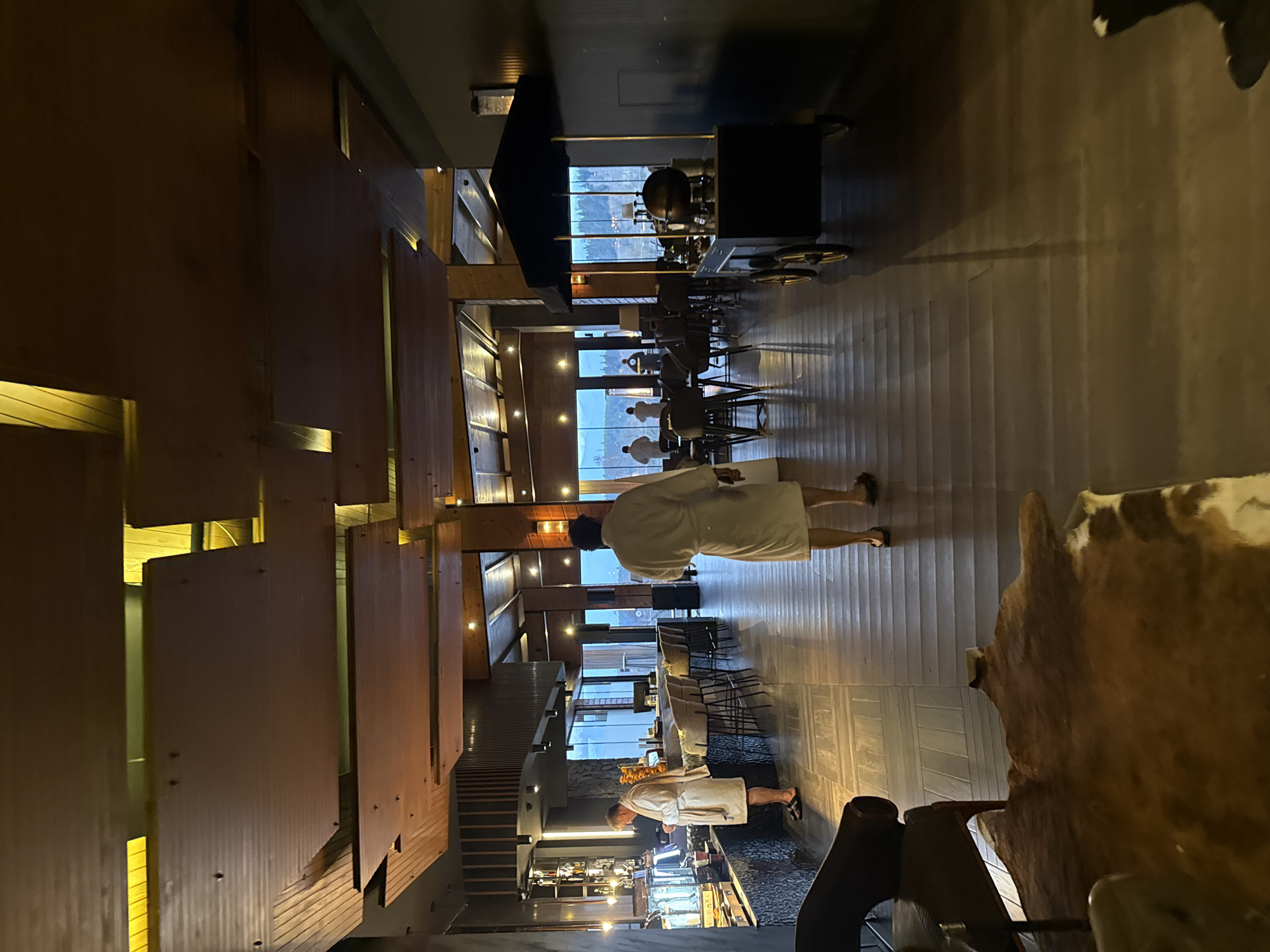 The image displays an indoor lounge or dining area within a facility in the city of Bania, Bulgaria. The space features a dark aesthetic with wooden ceilings and panels, integrated lighting strips, and recessed fixtures. The flooring transitions from dark tiles near a service counter to a dark wooden plank floor extending into the main area. Large, floor-to-ceiling windows along the back wall provide a view of an exterior landscape with trees and hills under a dusky sky. Three adult males are present in white bathrobes and dark sandals. One male stands at a dark-textured counter on the left, accessing items from a buffet-style display containing food and beverages. A second male walks away from the camera along the wooden plank floor in the central aisle. Three additional indistinct figures in bathrobes are silhouetted against the windows in the background. On the right, a dark mobile cart with a black canopy, four gold-rimmed wheels, and a spherical metallic object on its top surface is positioned. Seating includes light-colored bar stools at the counter and dark chairs with tables in the mid-ground. A dark armchair and a brown and white cowhide rug are partially visible in the bottom-left foreground.
