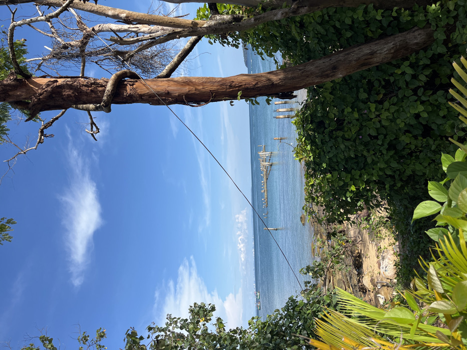 The image depicts a coastal scene in Koh Toch Village, Cambodia, viewed from a slightly elevated, vegetated vantage point. The foreground is framed by diverse green foliage, including broad leaves in the lower left and dense bushes along the bottom. On the right, a prominent reddish-brown tree trunk, around which a thick vine is tightly wrapped, stands vertically. Adjacent to it, a thinner, lighter-colored tree trunk exhibits sparse, dried organic material. A dark cable or wire extends diagonally across the upper-right quadrant of the image, passing in front of the reddish-brown tree. Beyond the immediate vegetation, a narrow strip of sandy and rocky beach transitions into calm, clear blue ocean water. In the mid-ground, a dilapidated wooden pier structure is visible, composed of numerous vertical wooden piles and horizontal crossbeams. Approximately ten light-colored birds are perched on various parts of this structure. Further to the left, a distinct fishing vessel with a visible cabin is present on the water. In the distant background, a faint urban skyline with multiple buildings is discernible on the horizon. The sky overhead is a clear, vibrant blue with several scattered white cumulus clouds. No human figures are present. The scene is illuminated by direct sunlight, indicating a clear day.