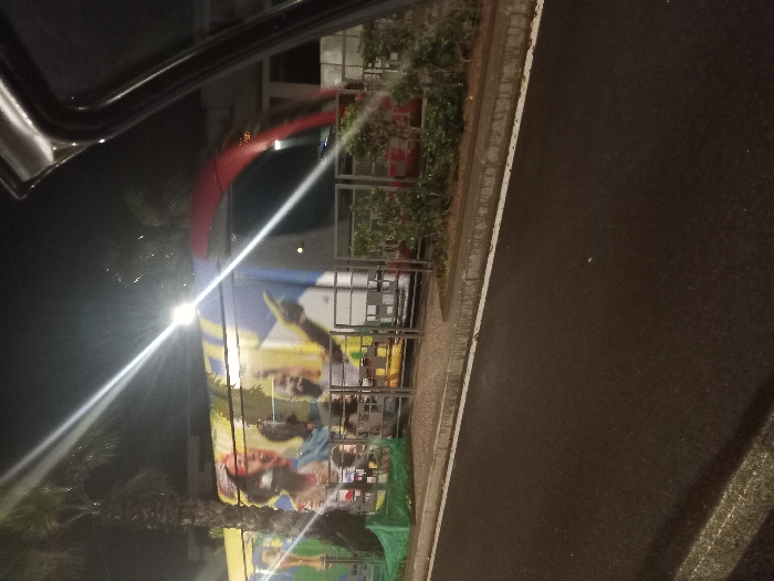 A vibrant billboard displaying images of athletes under bright light dominates the view. A partial palm tree is visible at the billboard's base. A red bus or vehicle is behind the billboard. The scene is observed from inside a car, part of its window frame is visible. To the right, the wet, dark asphalt of a street stretches away. A raised curb with greenery separates the road from the display. The overall lighting suggests a night scene.