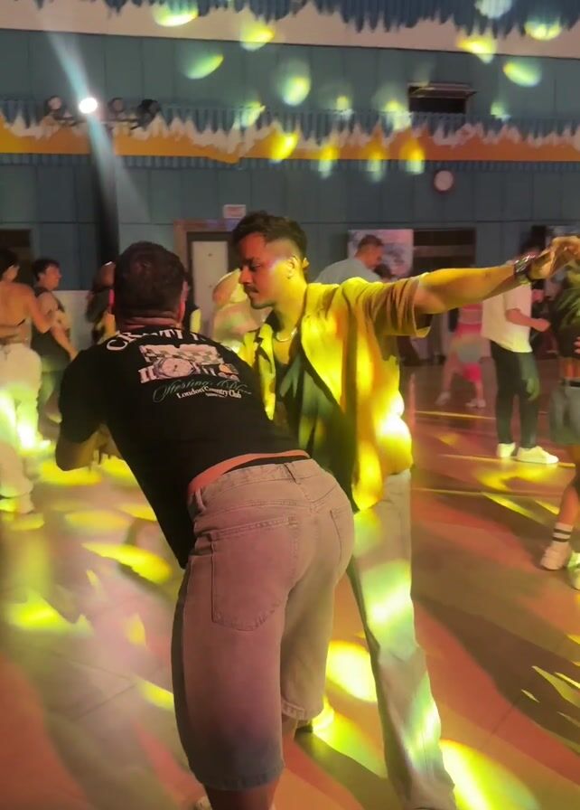 Two young men are dancing together in a large hall. They are the primary focus of the video and are positioned near the center of the frame. One man wears a black t-shirt and gray denim shorts, while the other is dressed in a brown shirt over a black tank top and gray pants. They appear to be enjoying themselves, laughing and smiling at each other. The hall is filled with other couples and individuals dancing. The lighting is colorful, with yellow and red lights creating a dynamic atmosphere. The hall itself has a stage at the back and decorative elements along the walls.