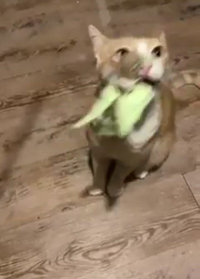 - "An orange and white cat sits on a brown wooden floor, looking upwards at a toy attached to a string being dangled near its face" by FM-xTDQG2, licensed under CC BY 4.0