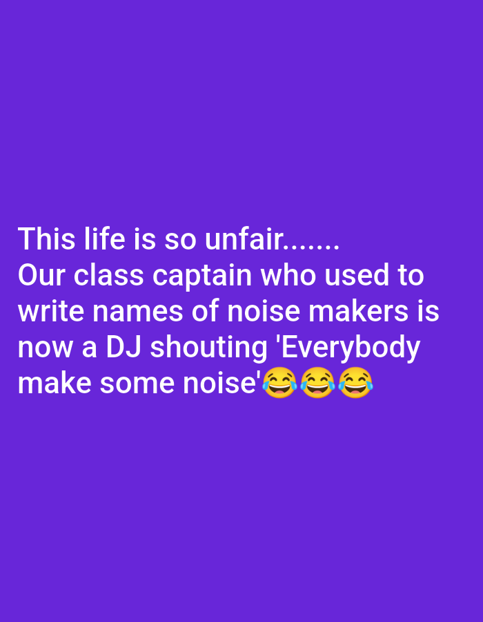 The image displays white text and three emojis against a solid purple background. The background is uniformly colored, without discernible patterns or textures. The text is centrally aligned and reads: "This life is so unfair....... Our class captain who used to write names of noise makers is now a DJ shouting 'Everybody make some noise'". Following the last word, three identical "Face with tears of joy" emojis (😂) are present. No other subjects, objects, people, or discernible environment elements are visible. The location is Unknown, Unknown.