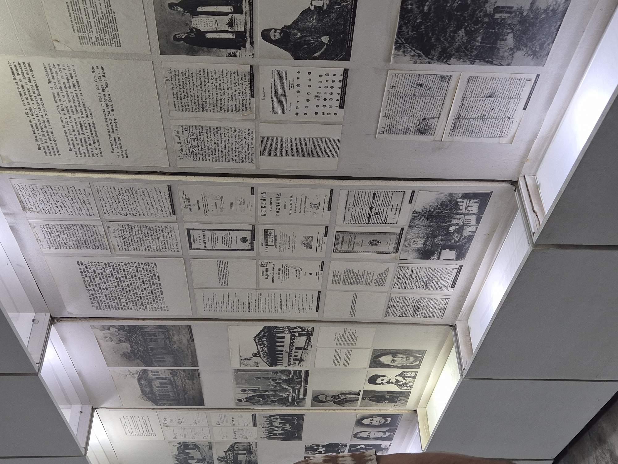 display case in what appears to be a museum or historical archive. The display contains numerous documents, photographs, and illustrations mounted on white panels. These items likely pertain to the history of Byala Cherkva, Bulgaria. Some materials include text-heavy documents, suggesting official records or historical accounts. There are also portraits and depictions of people, possibly important figures from the town’s past. Buildings and landscapes are also featured in some images. The display case is illuminated by lights built into its structure.