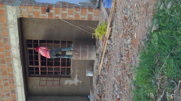 A partially constructed brick building features a window with a metal grate. A person in a pink shirt and blue jeans stands on a barrel outside the window. Next to the barrel is a pipe extending from the building. To the right, a wood plank lies on the rocky ground leading to an area covered with green grass. A blue bucket is visible at the top edge of the building.